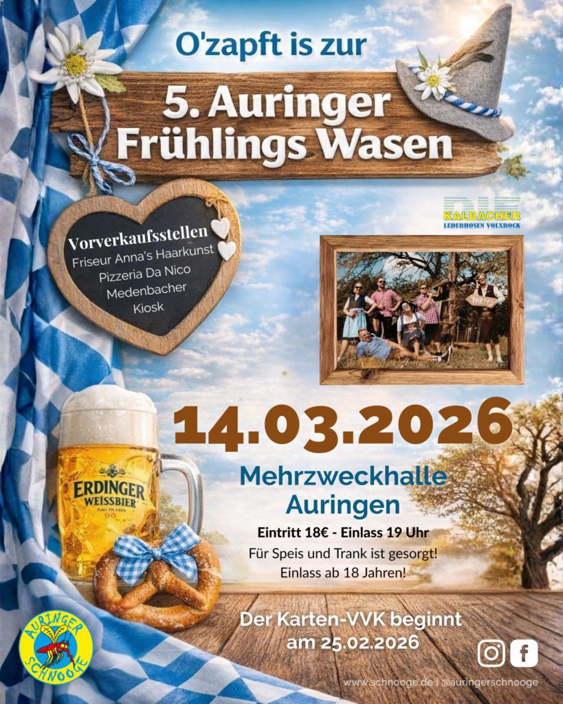 Die Schnooge lädt euch herzlich zur Auringer Frühlings-Wasen am 16.03.2024 in der Mehrzweckhalle Auringen ein! Taucht ein in die Frühlingsfreude und feiert mit uns eine unvergessliche Nacht! 🌸🎊